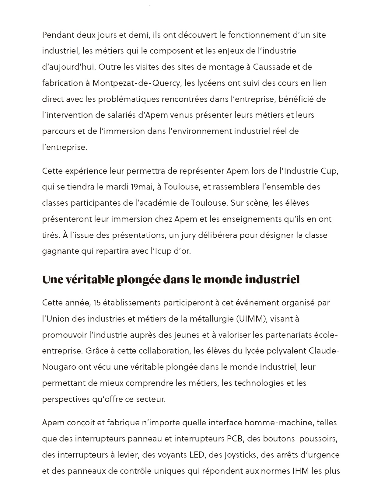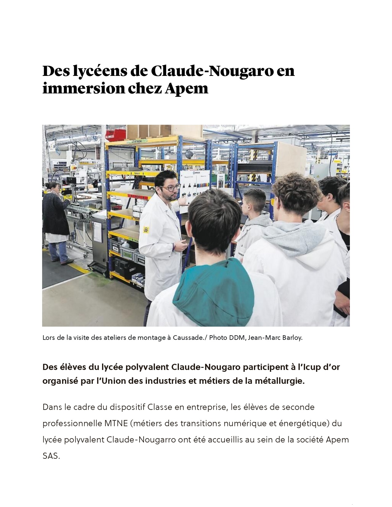 Lundi 9 mars, une convention a été singée entre le lycée, l'entreprise caussadaise APEM et l'UIMM ( Union des industries métallurgiques) d'Occitanie.